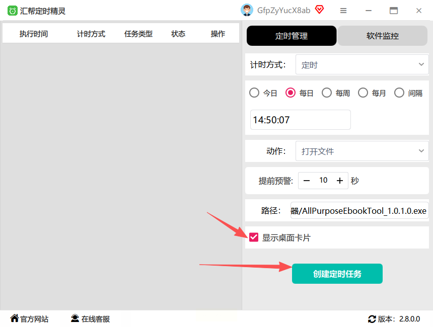之后勾选“桌面卡片”选项,确保任务完成后能在桌面看到相关提示,最后点击“创建定时任务”。