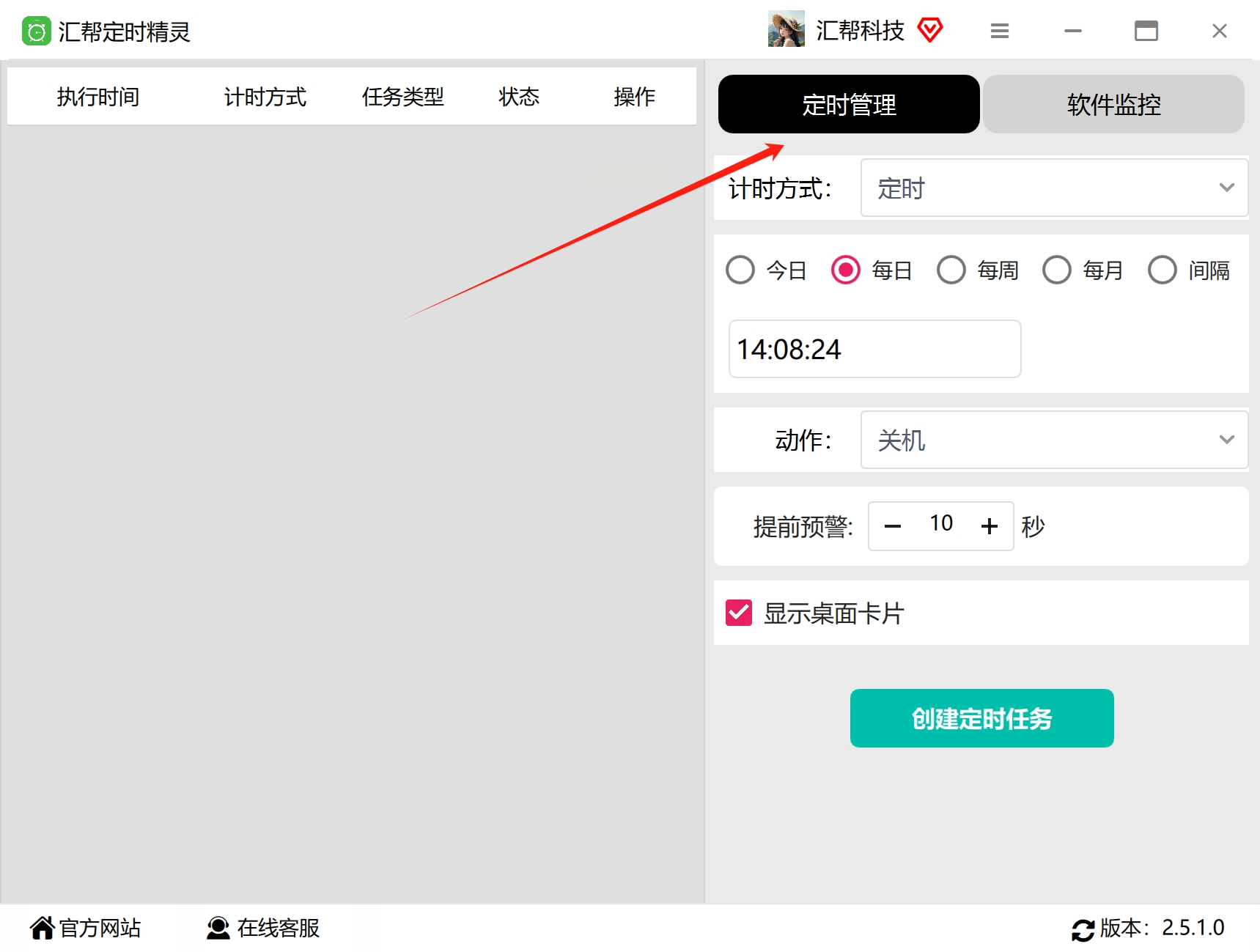 1. 在电脑上安装并运行“汇帮定时精灵”软件。进入主界面后,找到并点击“定时管理”功能选项。