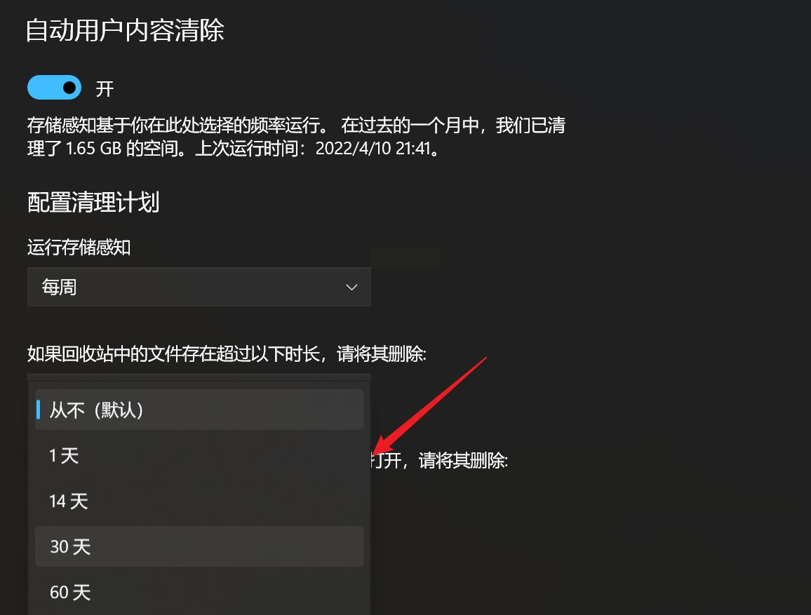 步骤七:在下方找到配置清理计划的选项,你可以设置自动运行存储感知的频率(例如每天、每周),系统会在你设定的时间运行清理任务。请注意,此方法依赖于系统计划任务,其执行和后续可能涉及的关机行为,不如专用软件直接可控。