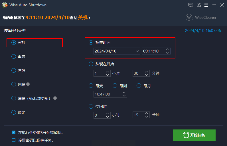 步骤1:打开Wise Auto Shutdown后,主界面左侧是任务类型列表,右侧是时间设定区域;