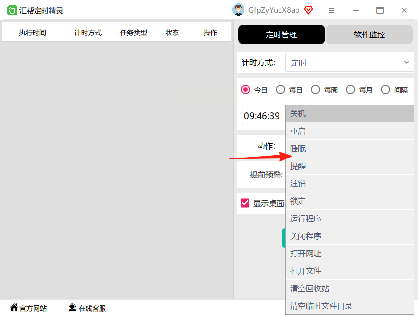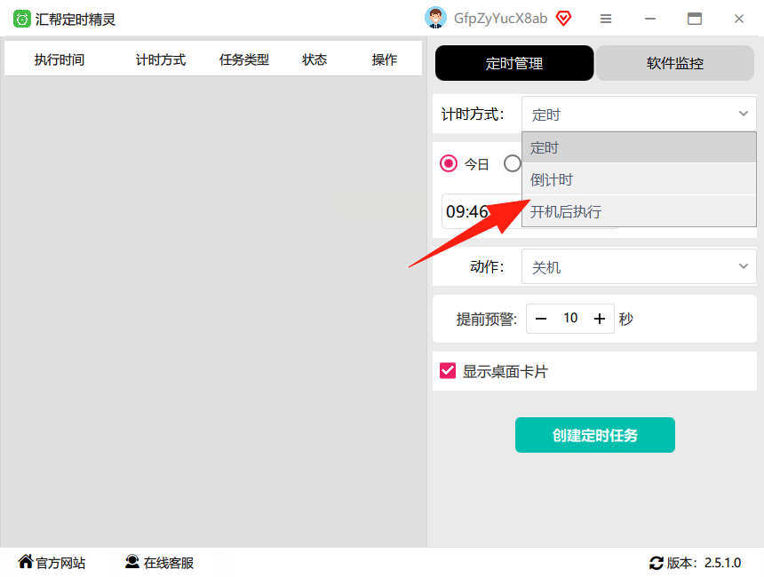 汇帮定时精灵的界面设计清晰,右侧是功能管理区,左侧则是已创建的任务列表,支持多种定时任务的设置和管理,精准实现自动关机需求。