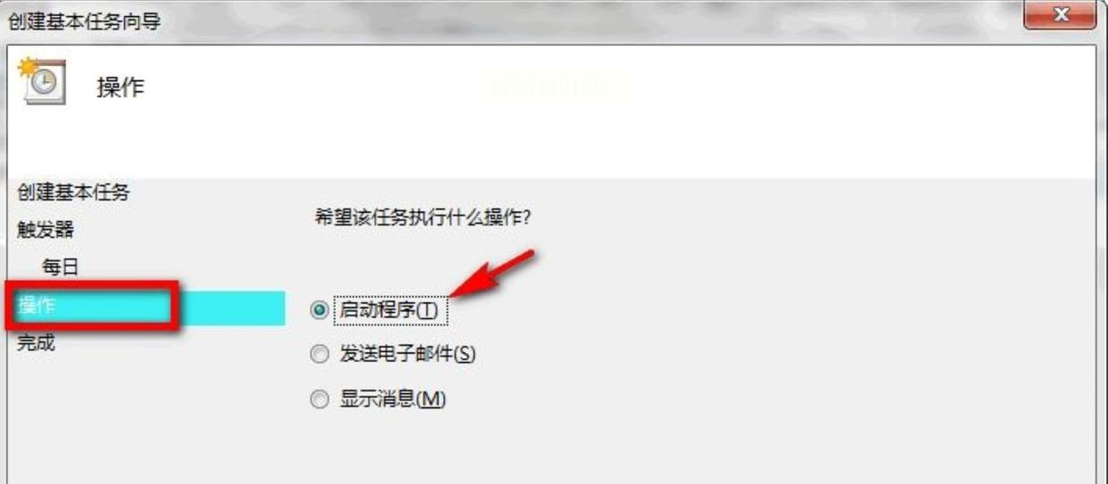 在“操作”界面,选择“启动程序”,然后点“下一步”。