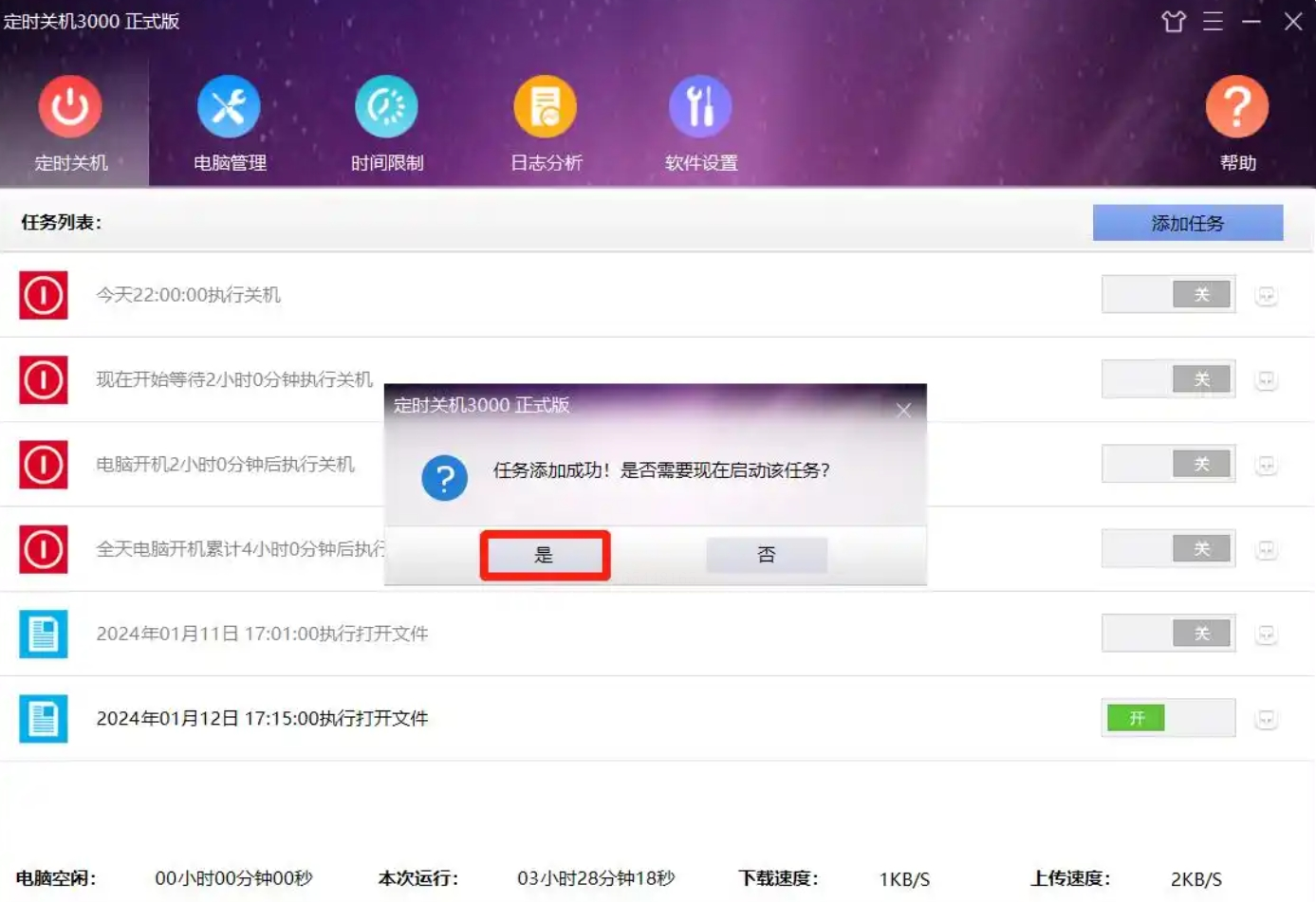 第四步:弹出确认窗口时,点击“是”,任务就生效了。