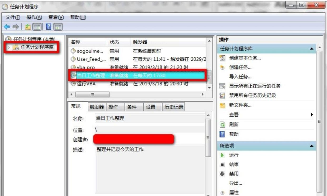 步骤12:创建好后,你就能在“任务计划程序库”里看到它了。以后每天到点,电脑就会自动启动Excel并打开那个文件。
