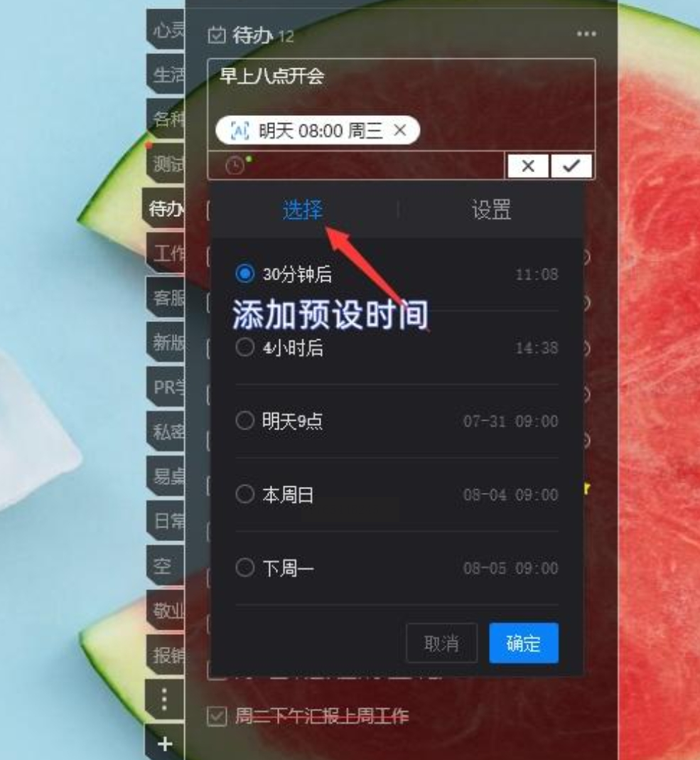 3. 手动选择预设时间:如果你觉得打字描述不够直接,也可以留意输入框附近或工具栏上的时间图标(通常是一个小钟表)。点击它,软件会提供一些预设的快捷时间选项,比如“1小时后”、“今晚”、“明天上午”等,直接点击就能设定。
