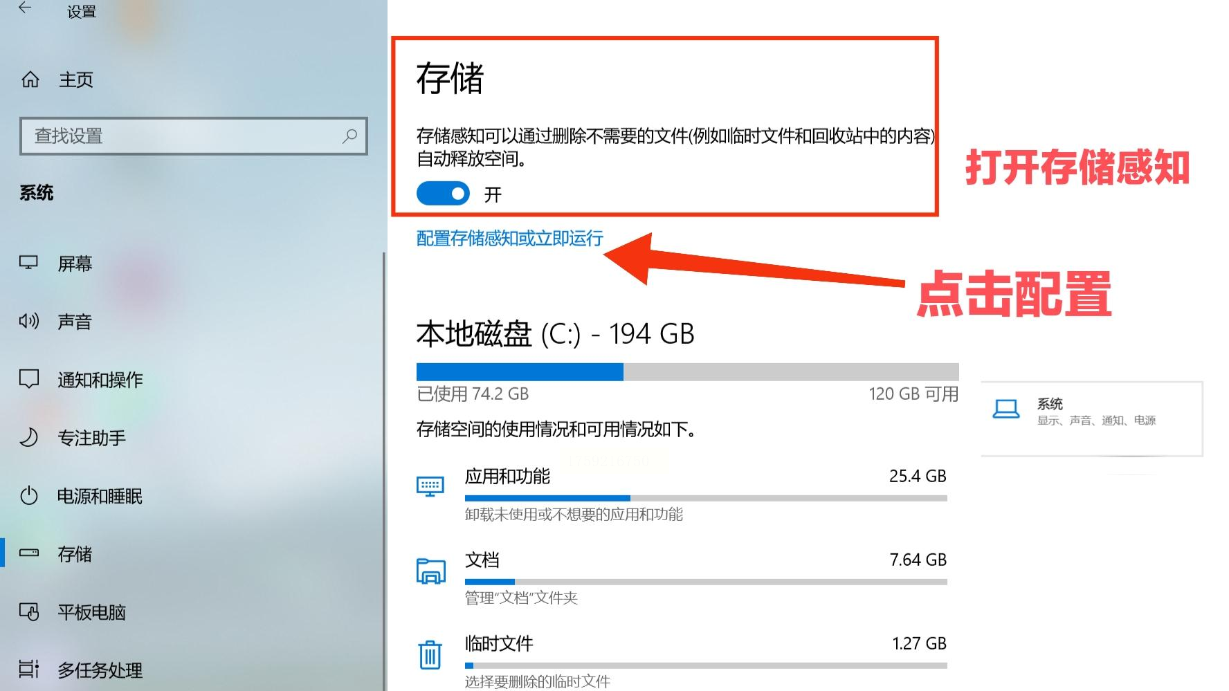 按下`Win+I`进入系统设置→“系统”→“存储”,开启“存储感知”开关。