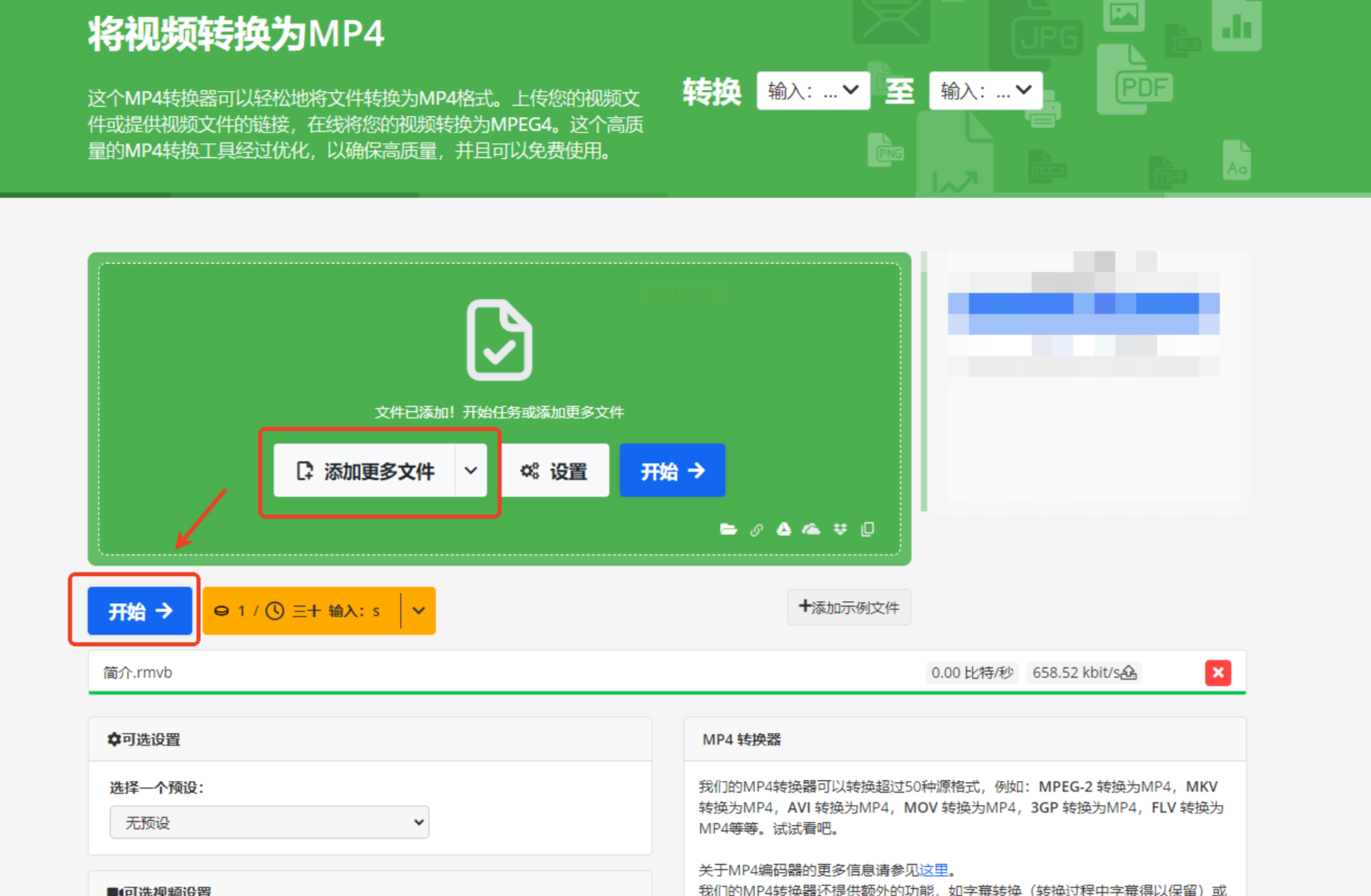 2. 上传RMVB视频文件(支持200MB以内文件),选择「MP4」输出格式