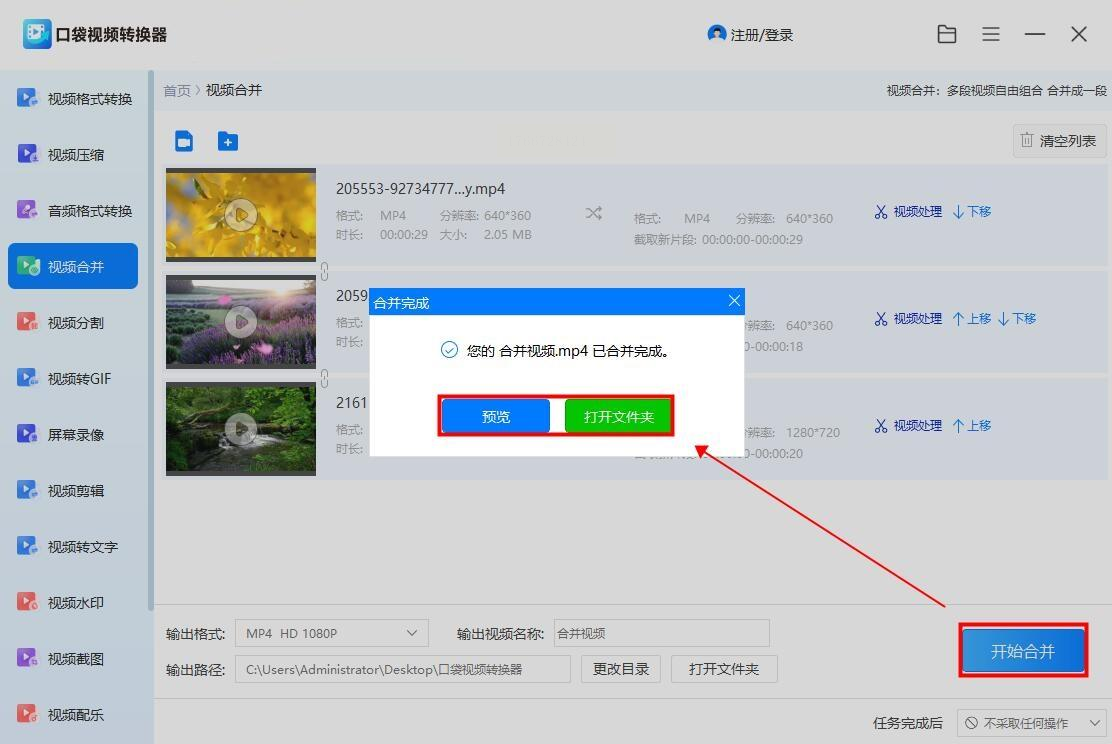 5. 一键合并:设置输出格式和清晰度后,点击“开始合并”,完成后会自动弹出预览窗口。