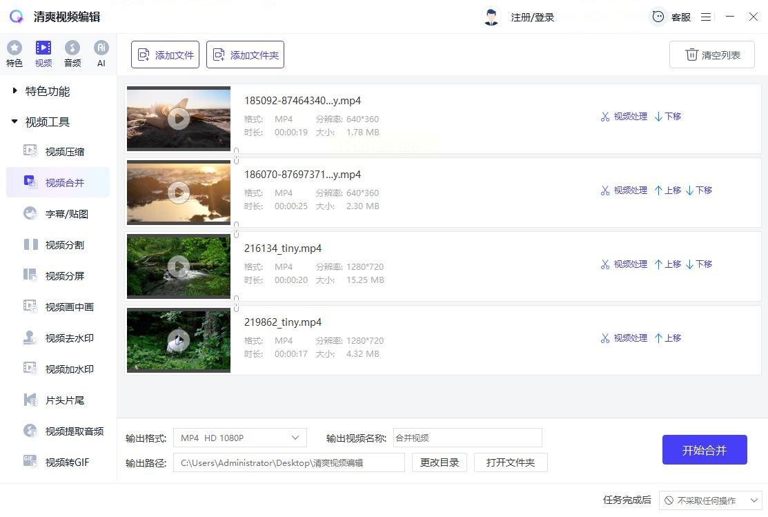 6. 开始合并:选择保存路径(默认在桌面,可自定义),点击“开始合并”按钮,等待进度条走完即可。