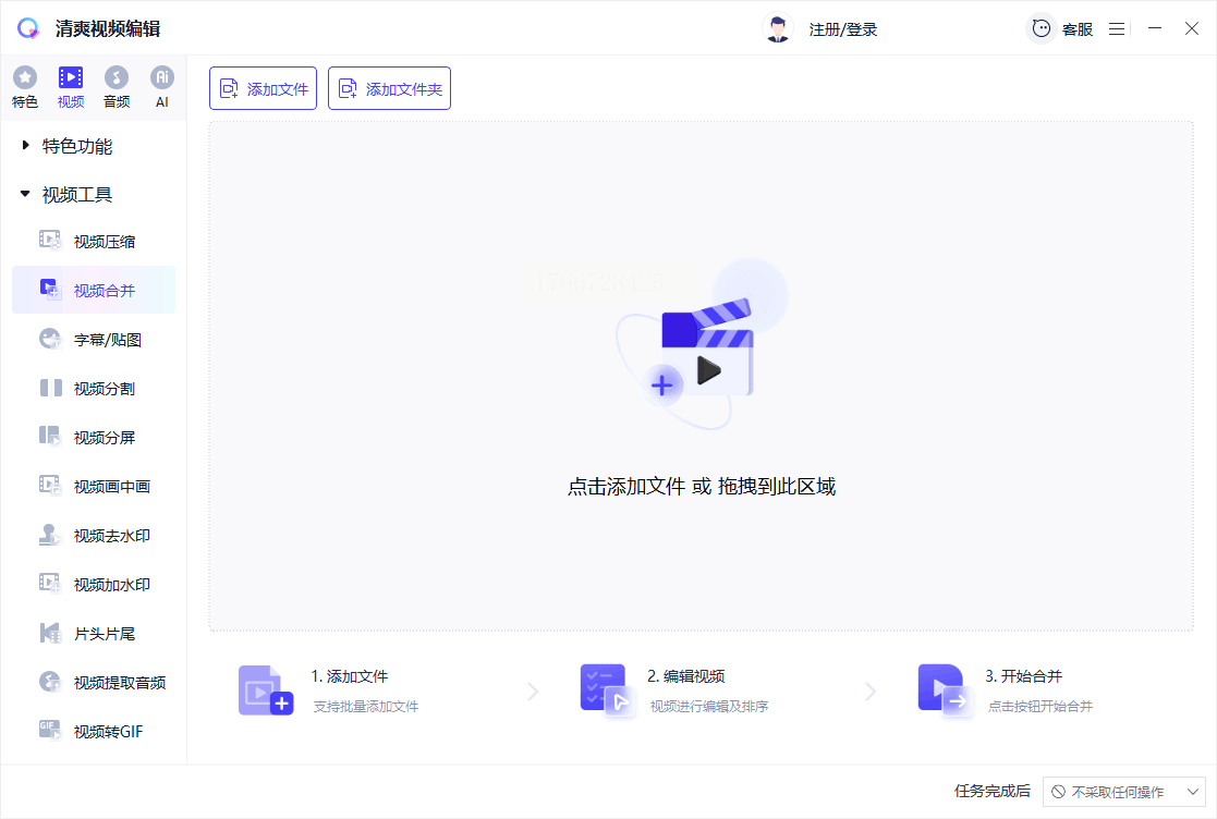 3. 上传视频:点击“添加文件”按钮,支持批量拖拽多个视频文件,格式可以不同(这点很实用!),文件大小也不受限。