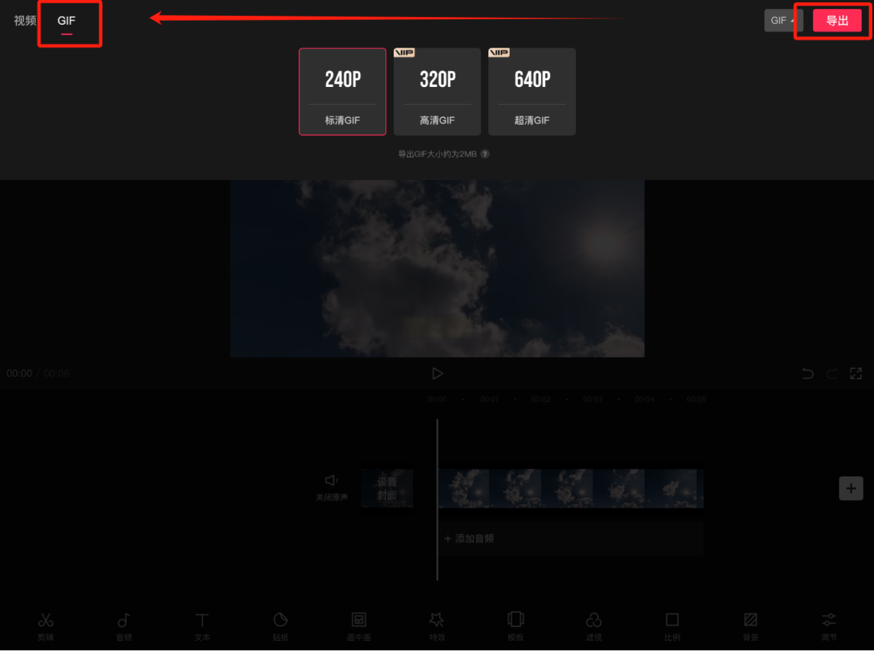 作为流行的视频编辑软件,剪映也内置了格式转换功能。适合已在剪辑过程中、需顺带输出GIF的用户。