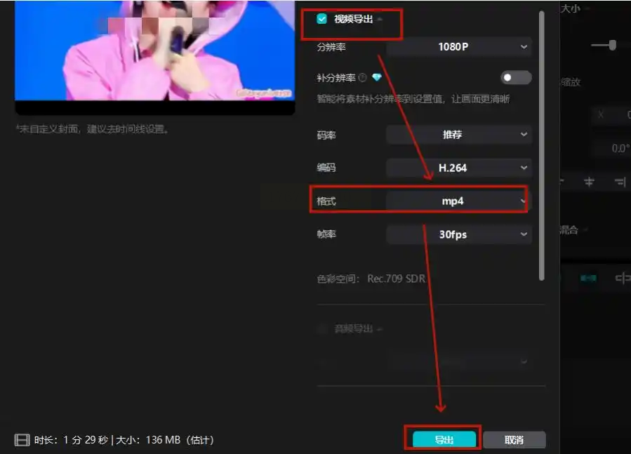 点击右上角的“导出”按钮。在导出设置窗口里,把“格式”选择为“MP4”,其他参数如分辨率、码率可以保持默认或按需调整,最后点击“导出”等待完成即可。