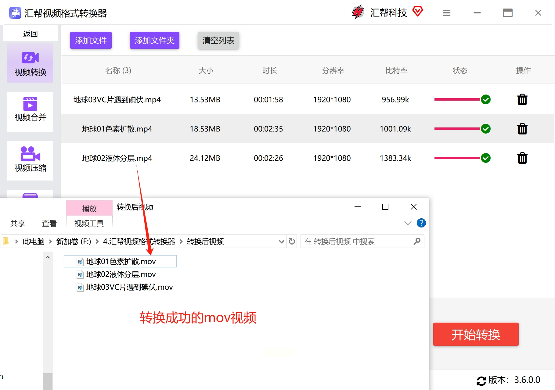 确认所有设置无误后,点击界面右下角的「开始转换」按钮。转换进度会实时显示在进度条中,完成后会弹出提示窗口,点击“打开文件”即可查看转换后的MOV视频。