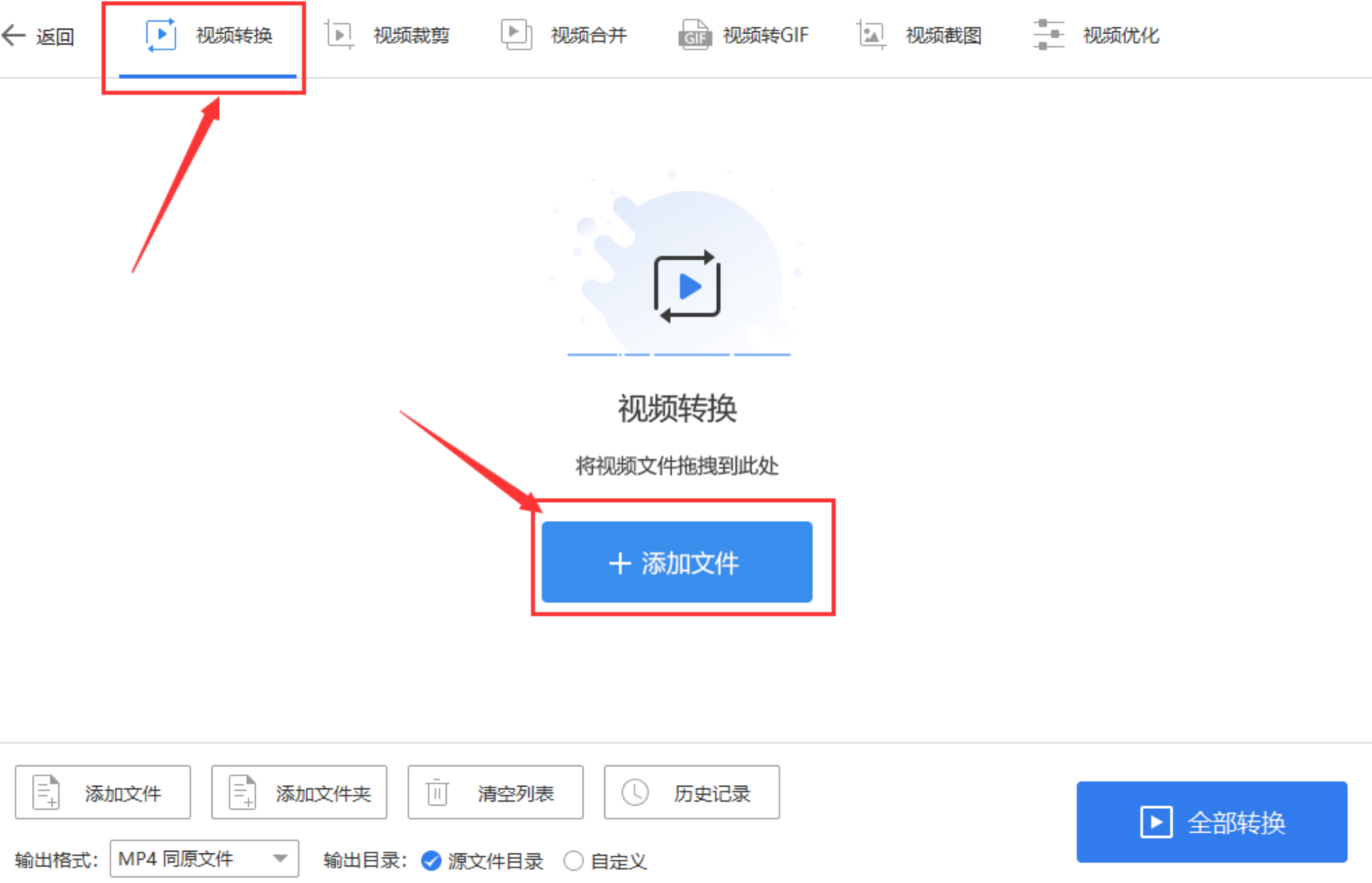 在主界面点击「视频转换」模块,界面左侧会显示“添加文件”和“添加文件夹”按钮(后者适合批量处理多个视频)。