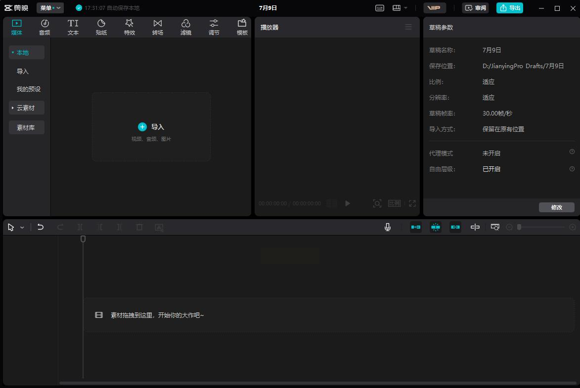 步骤一:启动软件进入剪辑页面,新建时间线并设置项目参数。