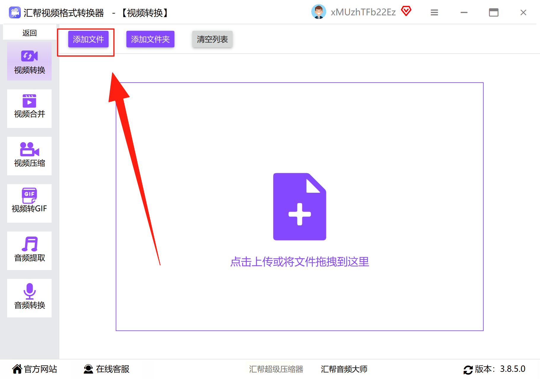 1. 进入"视频转换"界面,点击"添加文件"