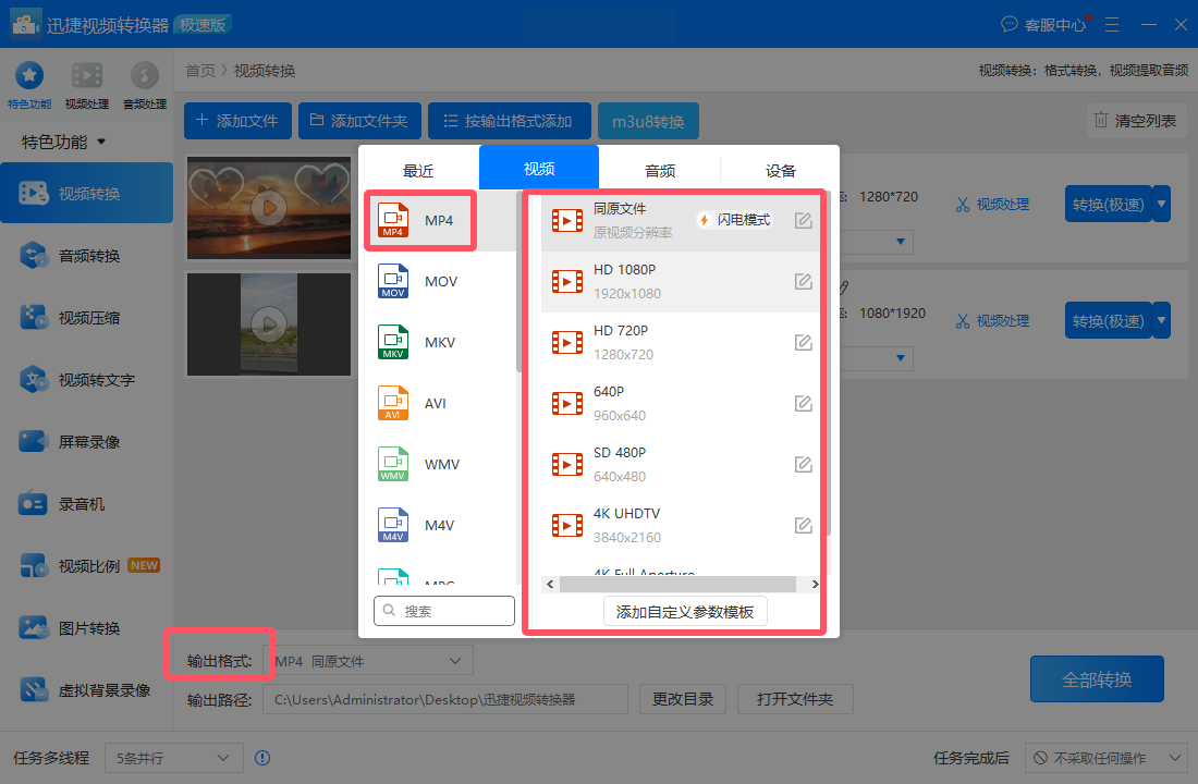 4. 在"输出格式"栏选择MP4,可选择"极速转换"或"原速高画质"模式