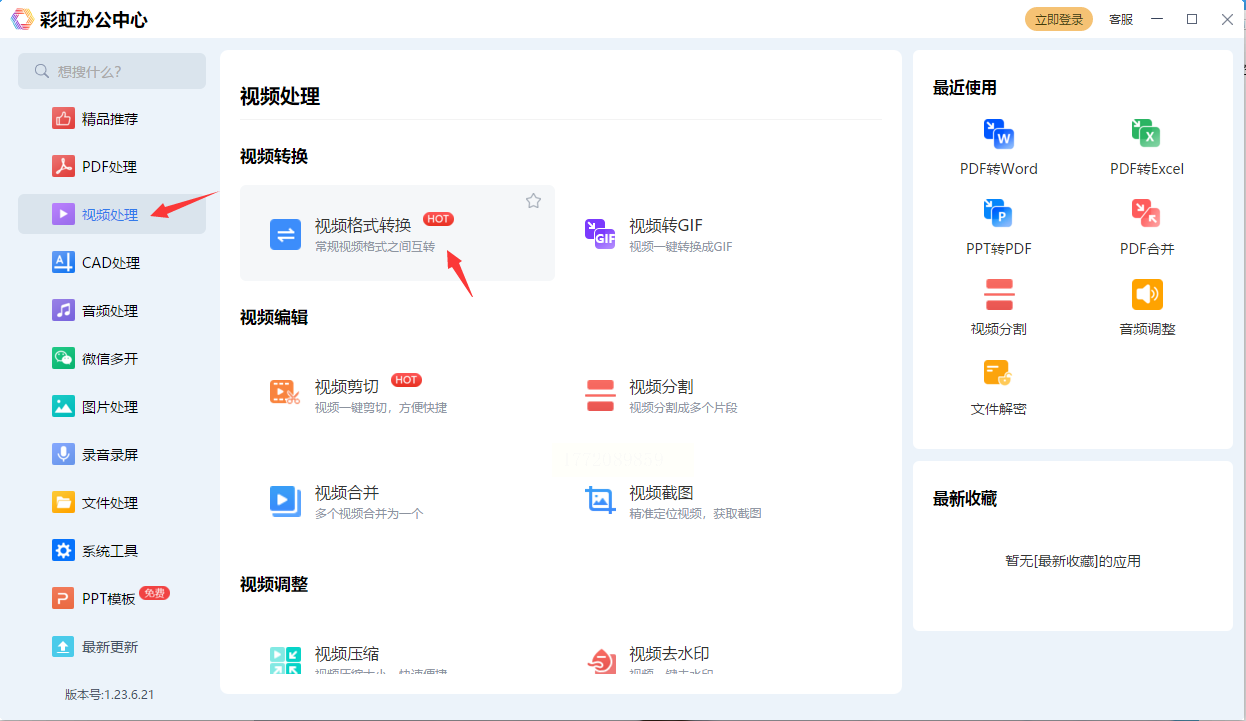 1. 打开彩虹办公中心,在左侧工具栏找到"视频处理"模块