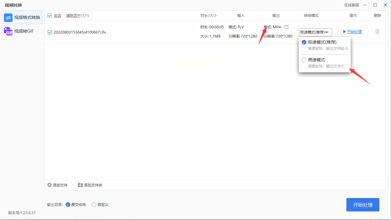 4. 在"转换模式"中选择"极速"(适合赶时间)或"原速"(适合画质优先)