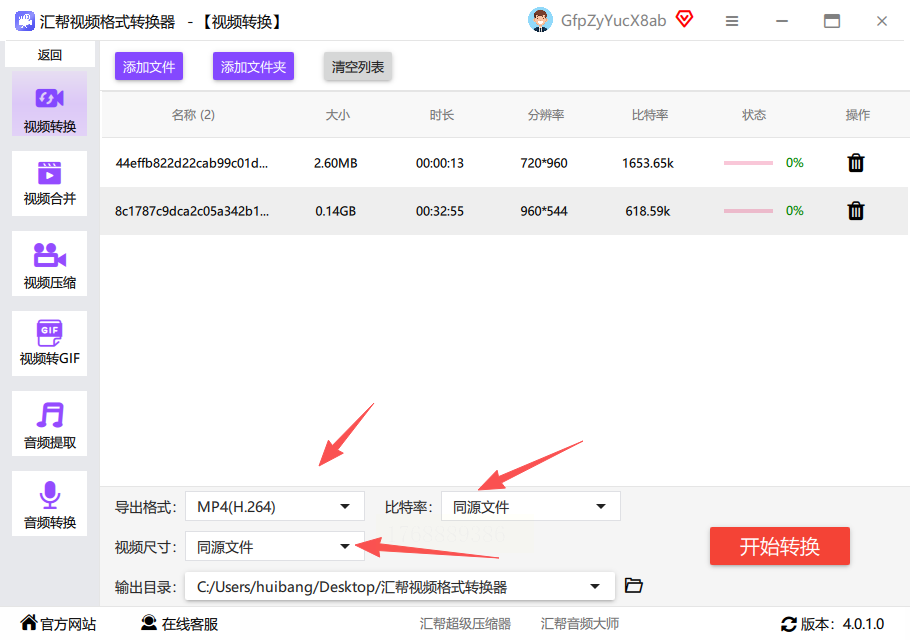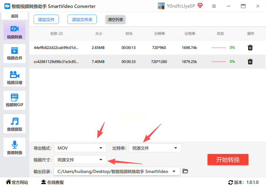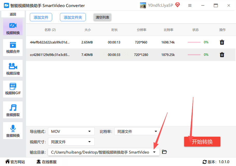 步骤三:所有待转换的视频会以列表形式呈现。在列表下方或每个文件旁边,你会找到输出设置区域。在这里,你可以为视频选择目标格式,并自定义像比特率、分辨率(视频尺寸)这样的参数。