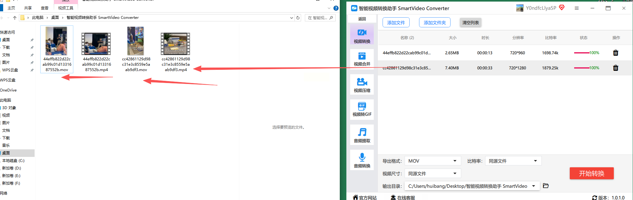 步骤六:稍等片刻,转换就完成了。你会在设定的输出文件夹里看到新生成的MOV文件。原来的MP4文件还会完好无损地保留着,不用担心被覆盖。