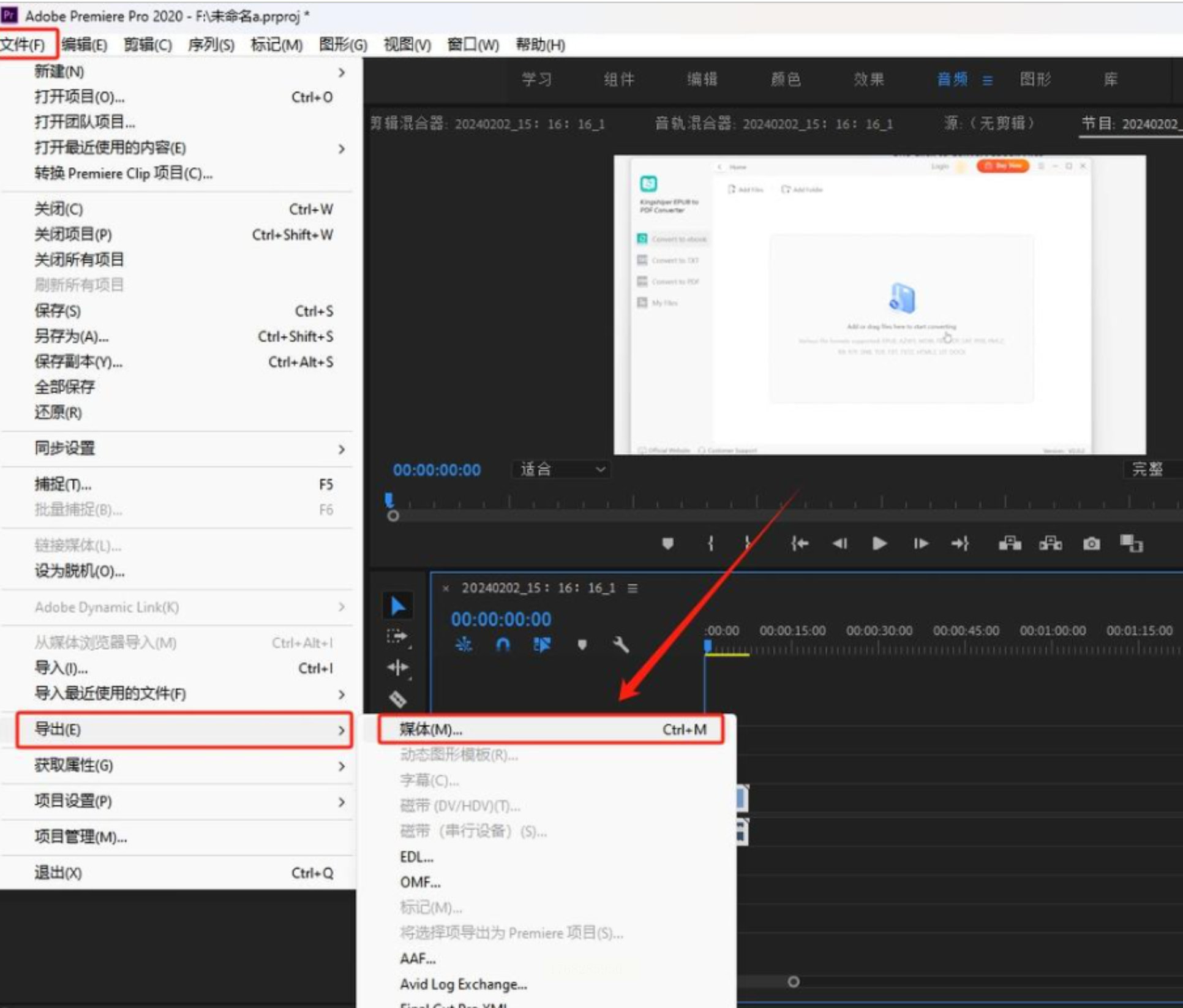 3. 将视频拖入时间轴,点击"文件"→"导出"→"媒体"。