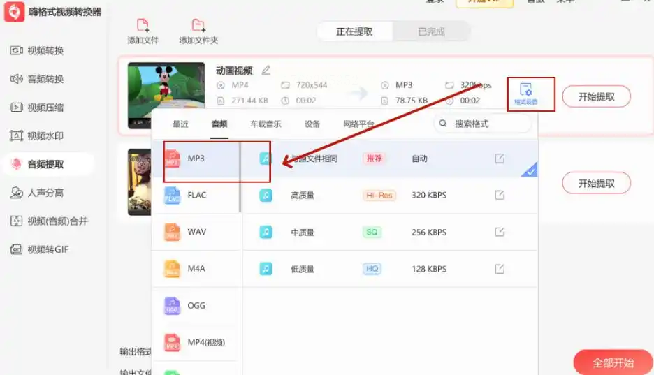 2. 点击"格式设置",在弹出窗口中选择音频格式(MP3/WAV/FLAC)及比特率(128-320kbps)。