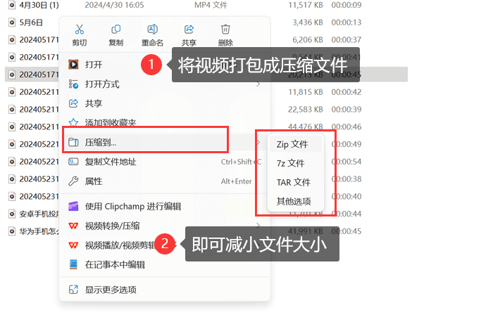 对于电脑端的单个或少量视频文件,可使用系统自带的压缩工具: