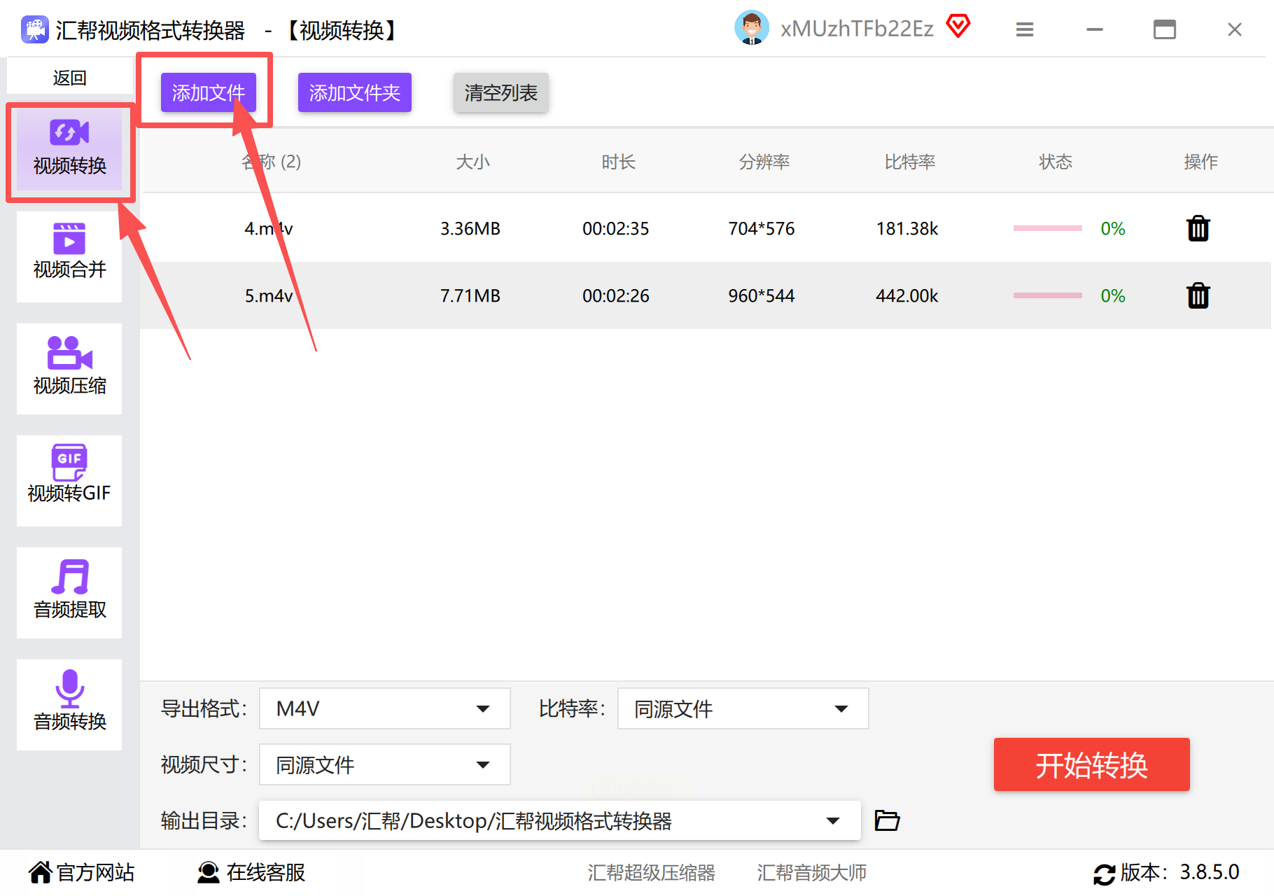 点击界面中的"添加文件"按钮,在文件浏览器中选择目标m4v视频,支持多文件同时添加。