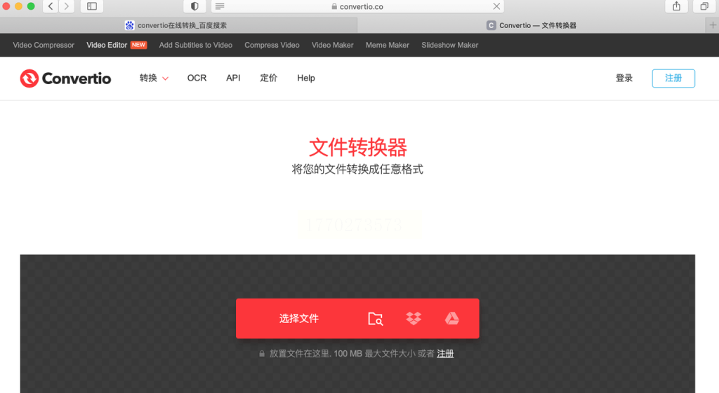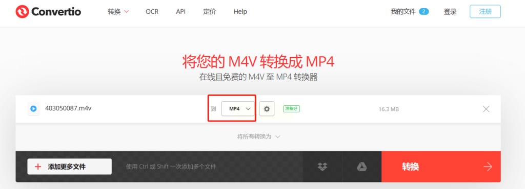 点击"选择文件"按钮,从本地文件系统或云存储(Google Drive/OneDrive)导入m4v文件,支持拖放操作。
