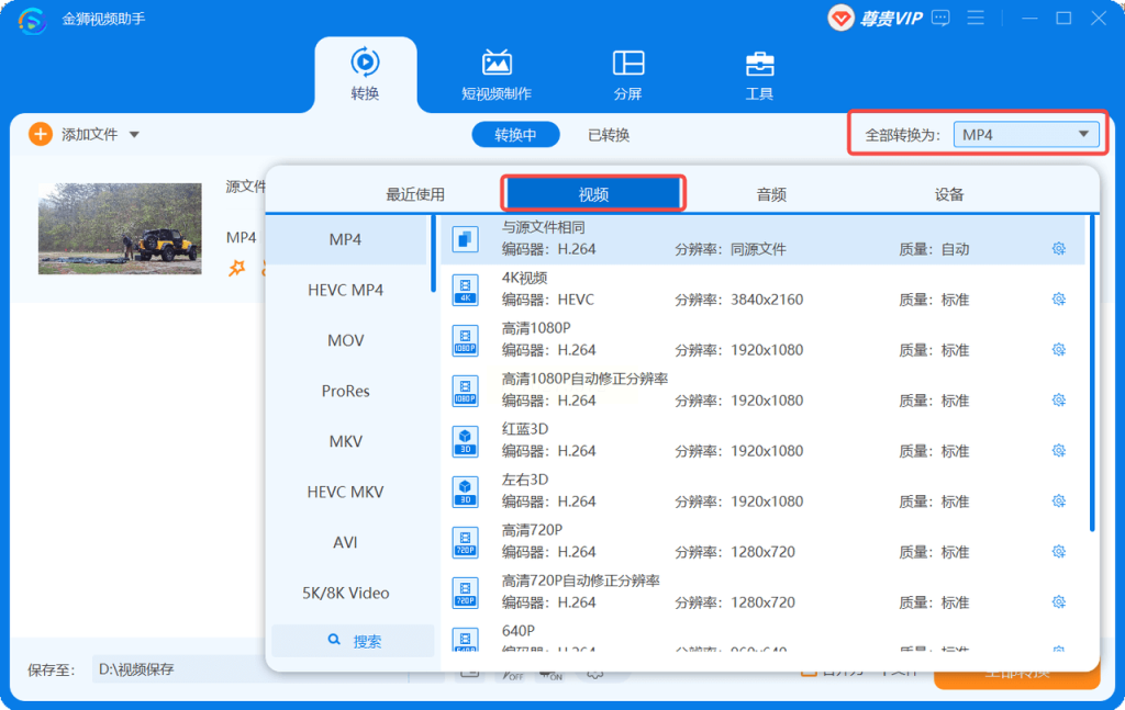 - 点击右上角"输出格式"下拉菜单,选择"MP4"并展开参数面板
