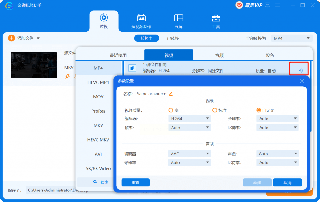- 选择MP4格式后,可直接使用"快速转换"预设(适合一般用途)或"自定义设置"(专业参数调节)