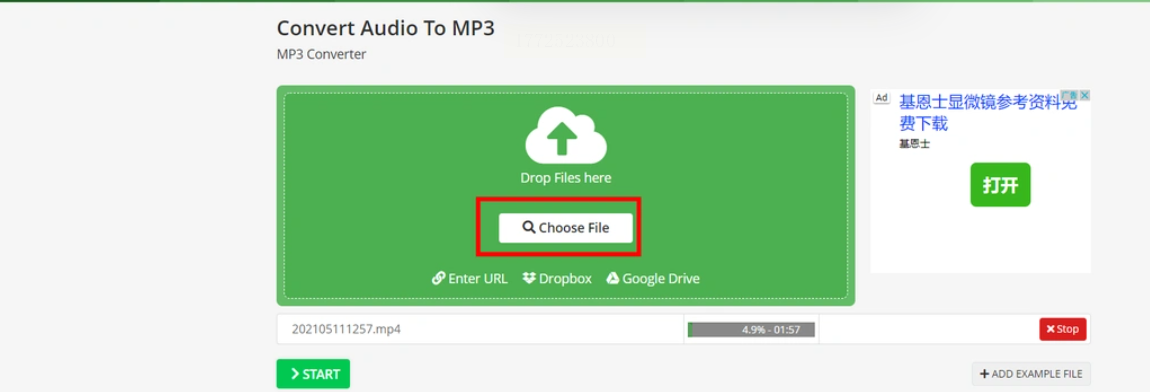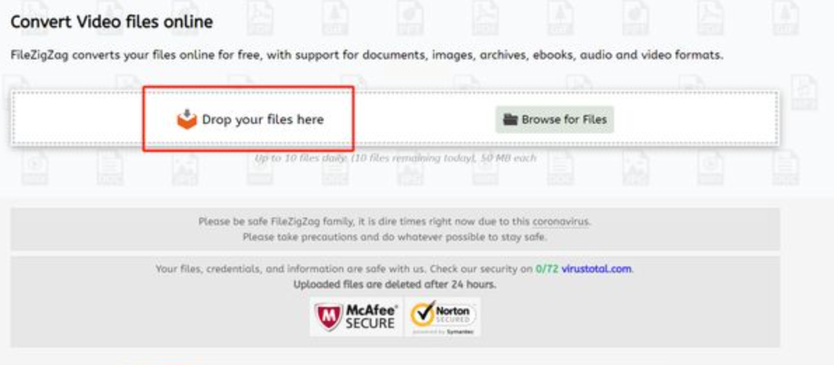 1. 打开FileZigZag网站(无需注册),点击页面中间醒目的【Drop your files here】按钮,直接把m4v文件拖进去,或者点击选择文件。