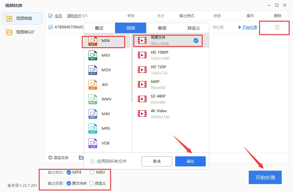 3. 快速设置参数:输出格式默认选“MP4”,下方会自动匹配常用分辨率(如手机用720P、电视用1080P),直接选对应选项即可。