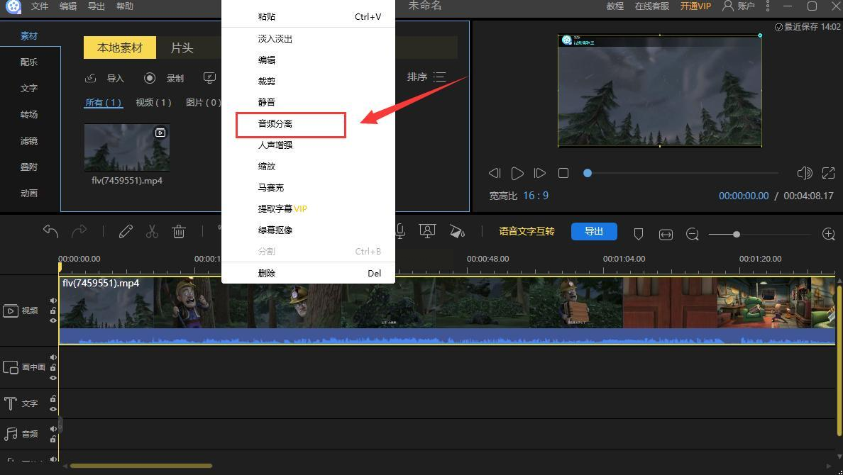 3. 音频分离+删画面:把视频缩略图拖到轨道上(就像把积木搭到轨道上),右键视频轨道上的片段,选"音频分离",这时候轨道上会多出一条音频轨道,视频画面就可以删掉啦(点轨道上的视频片段,按Delete键就行~)