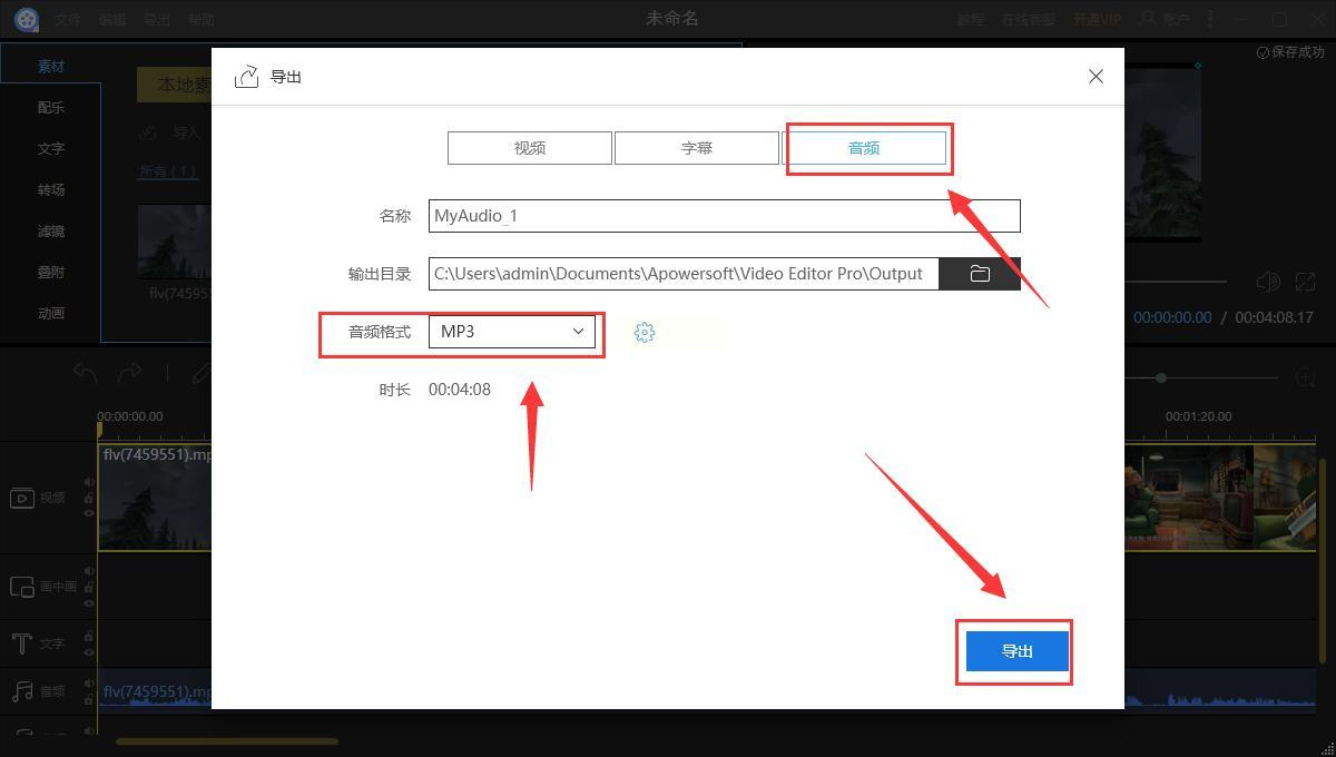 4. 裁剪导出音频:如果音频太长,想剪掉多余部分,就点左上角的"剪刀"图标,在音频轨道上想剪的地方点一下,然后选中多余部分按Delete删除。剪好后,点"导出",格式选"音频",格式选MP3,点"确定",音频就做好啦~