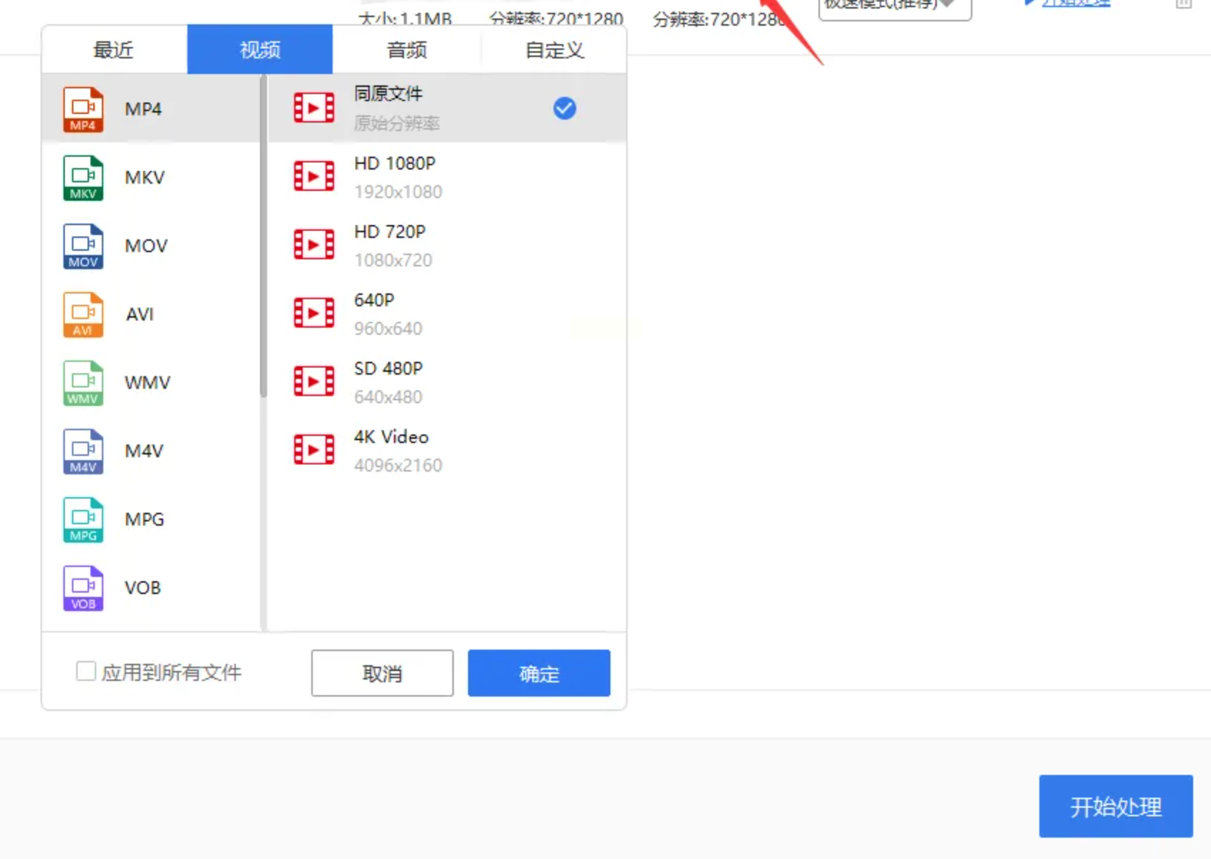 3. 在格式选项中选择"MP4",勾选"自动修复视频"(可选)
