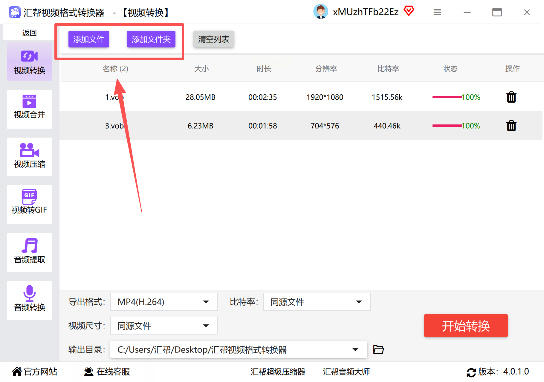 2. 点击"添加文件"导入vob文件,支持按Ctrl多选多个文件