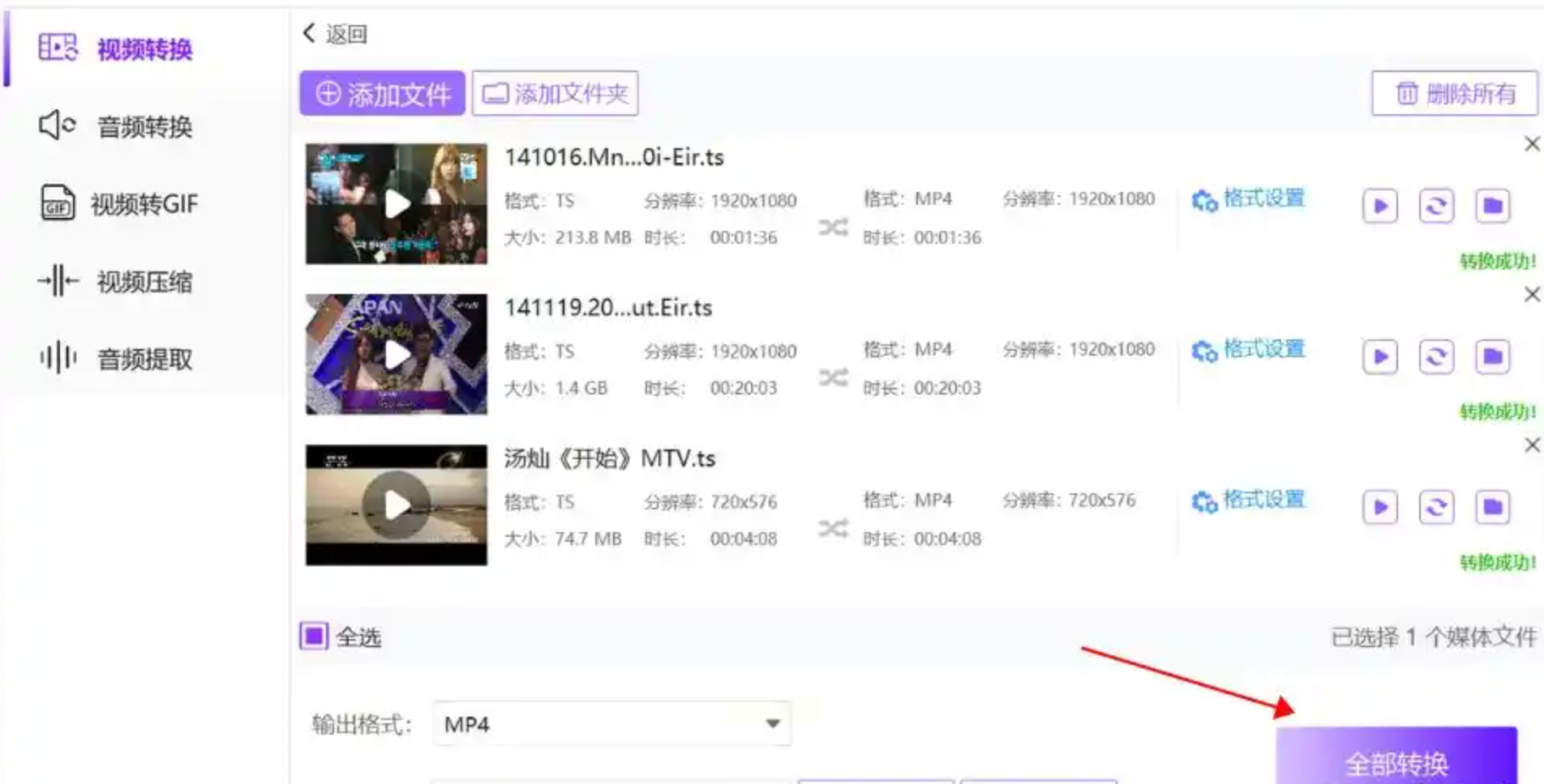 5. 点击右下角"全部转换",完成后可在软件内预览视频片段
