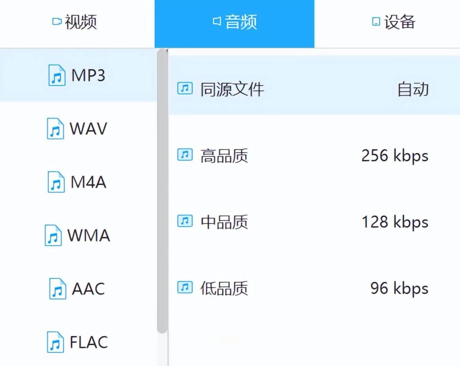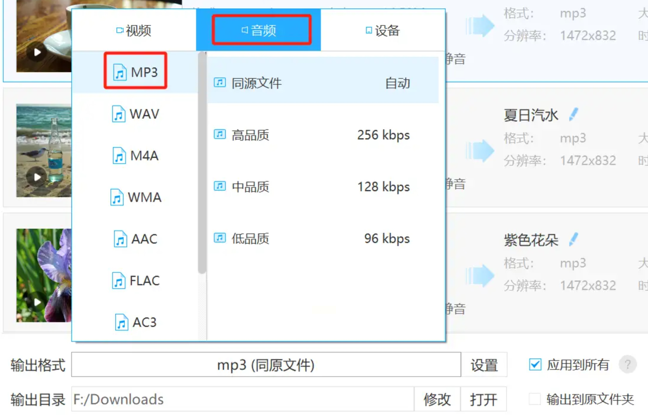 4. 选择输出格式:点击"输出格式"下拉菜单,切换到"音频"分类,然后选择"MP3"作为目标格式。软件支持多种音频格式,但MP3是最通用的选择。