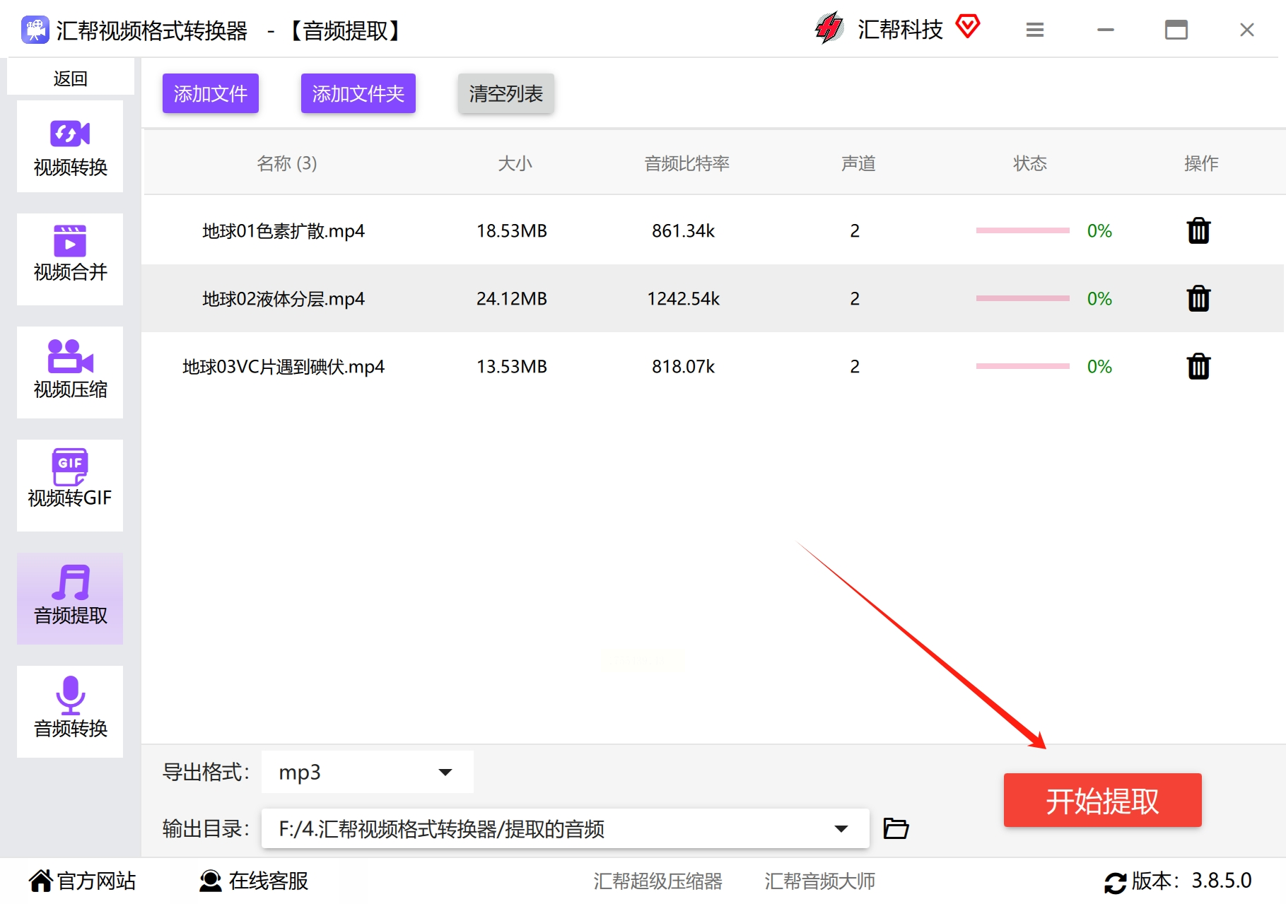 5. 开始转换:点击"提取音频"或类似按钮开始转换过程。转换时间取决于文件大小和网速,期间请保持网络连接稳定。