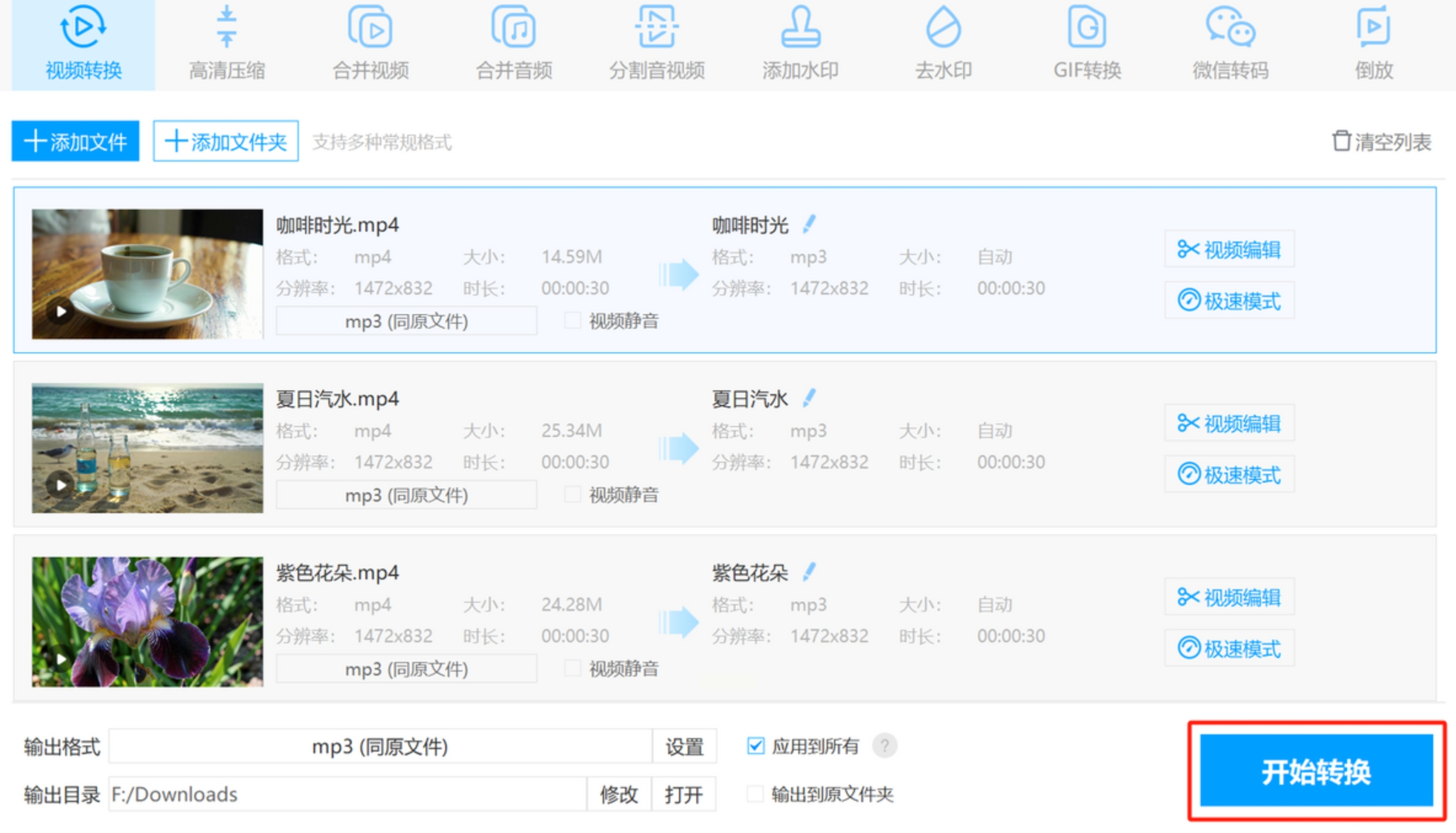7. 开始转换:确认所有设置无误后,点击右下角的蓝色"开始转换"按钮。转换时间取决于视频数量和长度,完成后点击"查看"按钮就能找到生成的MP3文件了。