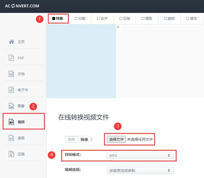 - 步骤三:点击"选择文件"上传MP4视频