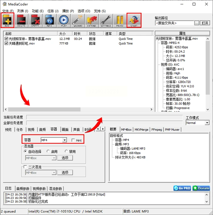 2. 添加MOV文件后,选择“转换”,配置文件选择“H.264 + MP3 (MP4)”;