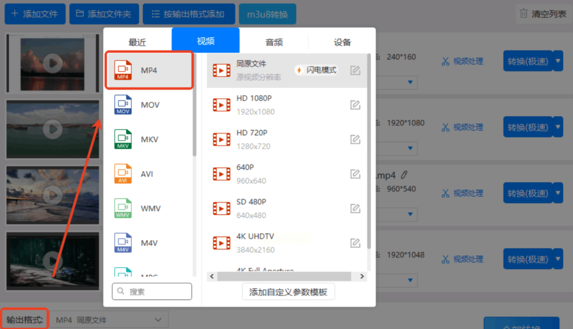 2. 输出格式默认MP4(可自定义分辨率);