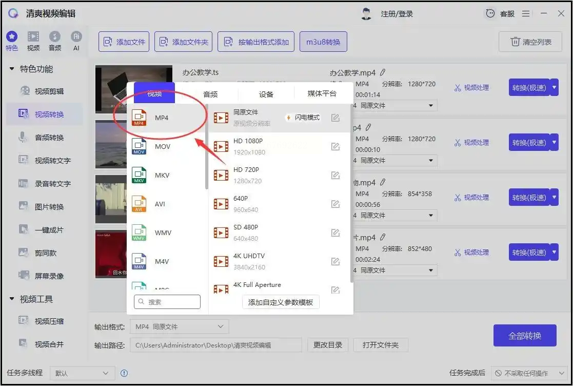 步骤三:在界面下方找到“输出格式”选项,点击展开格式列表,在视频分类中选择“MP4”。你还可以进一步选择该格式下的具体品质预设(如高清、标清)。
