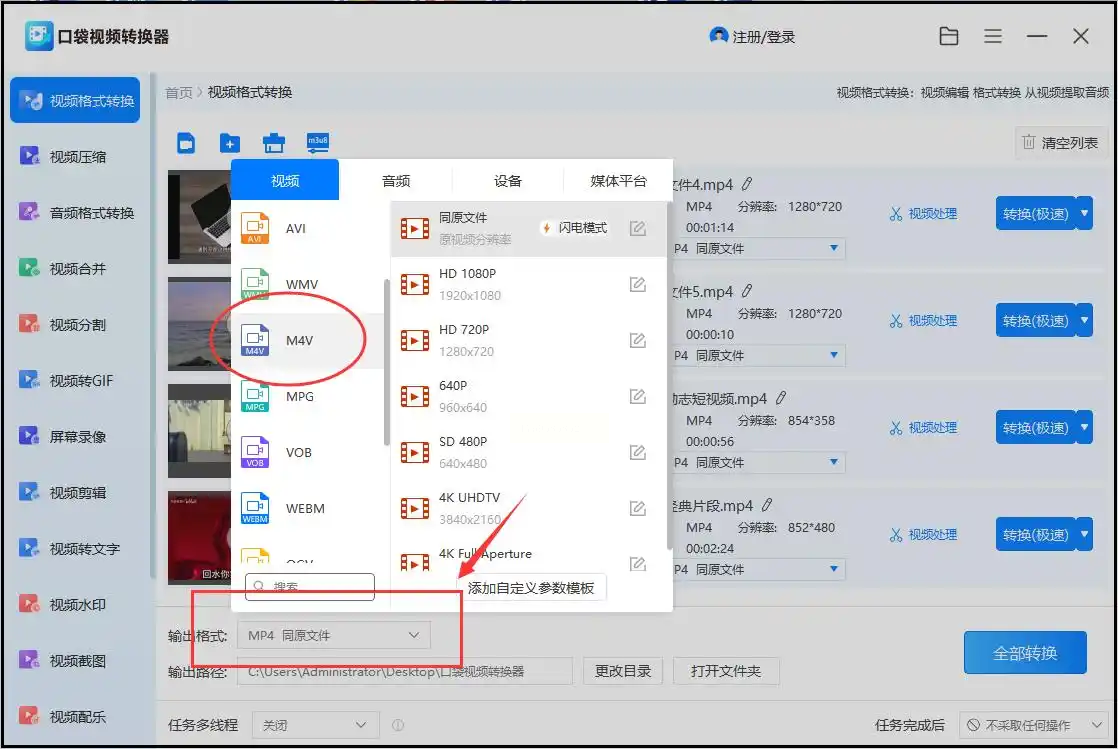 步骤三: 视频导入后,在输出格式选项中选择"M4V",同时可以根据需要调整视频参数,比如比特率和分辨率等。