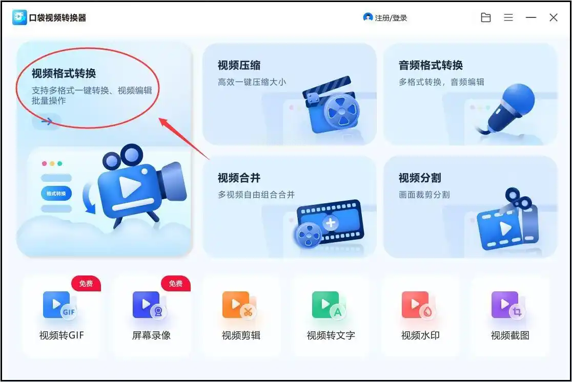 步骤一: 打开口袋视频转换器,在主界面选择"视频格式转换"功能。