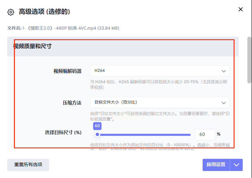 - 视频质量:数值越大,画质保留越完整(如70-90之间可平衡大小与清晰度)。