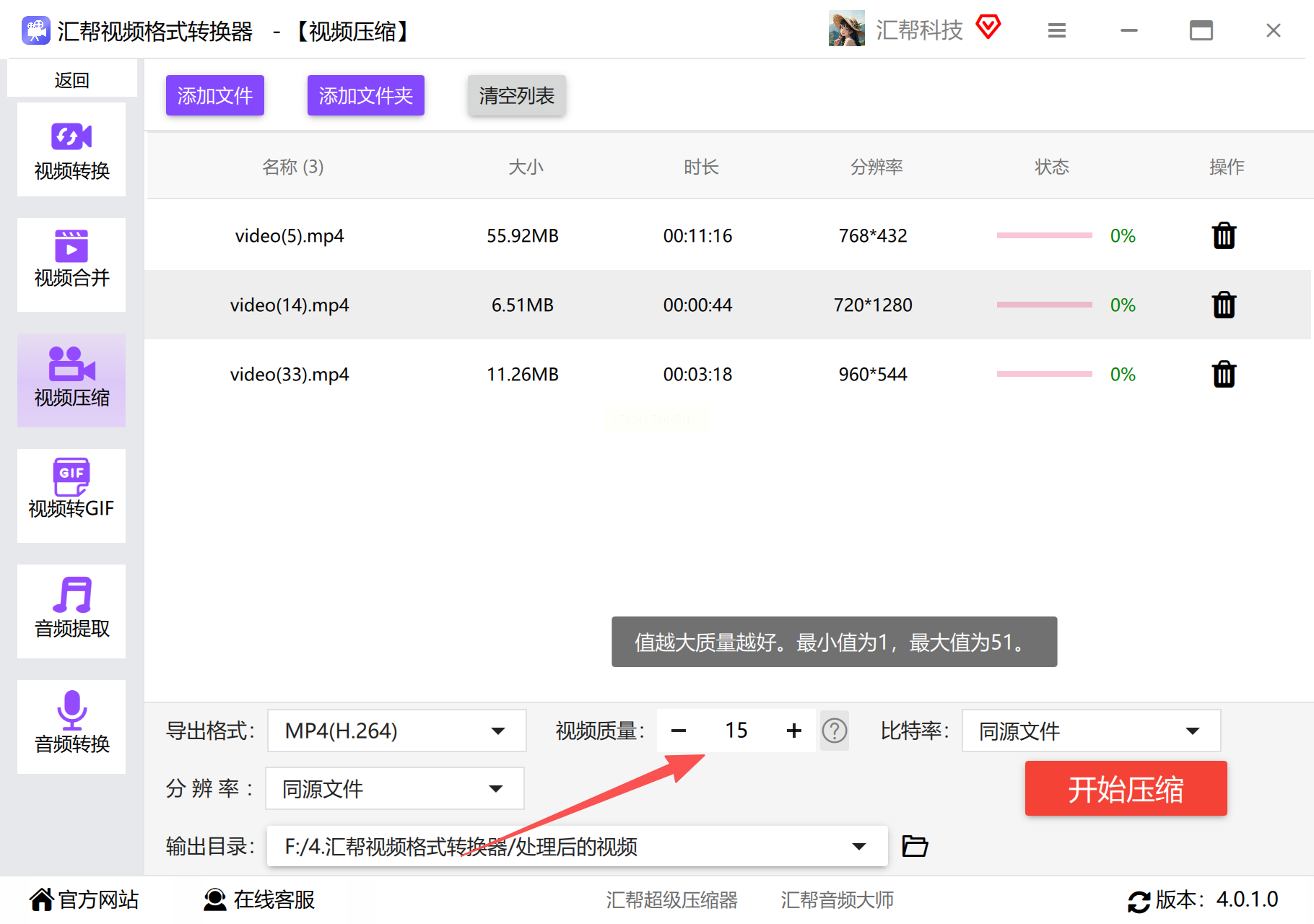 这是压缩过程中最关键的一步。在参数设置区域,你会看到“视频质量”或类似名称的滑块或数值输入框。这个值通常以百分比或具体数值表示,它直接决定了压缩后视频的文件大小和画质水平。一般来说,数值设置得越低,文件压缩得越小,但画质损失可能越明显,所以一般选择一个中间值即可。